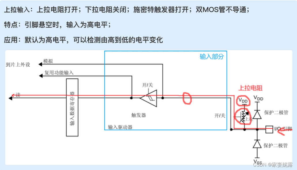 | 上拉输入 | 输入 | 可读取引脚电平,内部连接上拉电阻,悬空时默认⾼电平 |