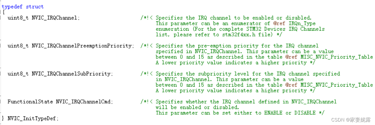 NVIC_IRQChannelCmd:使能中断,由于NVIC属于内核中的器件,默认时钟也是开启的,所以大部分情况下不需要单独设置使能中断。