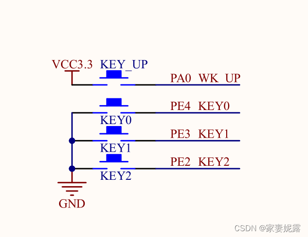 由原理图可知:控制按键Key_0和Key_1的GPIO端口是GPIOE,引脚是PE4和PE3。