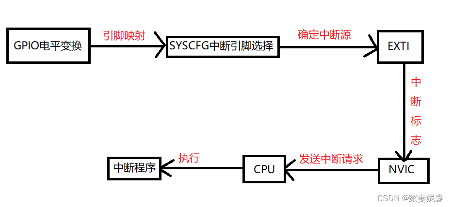 EXTI可以监测指定GPIO口的电平信号,当其指定的GPIO口产生电平变化时,EXTI将立即向NVIC发出中断申请,经过NVIC裁决后即可中断CPU主程序,使CPU执行EXTI对应的中断程序。如图: