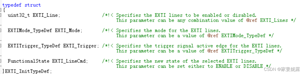 EXTI_Line:中断通道,根据中断源的引脚选择(EXTI_Line0~EXTI_Line15)。
