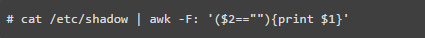 任何空密码的账户意味这可以让Web上任何无授权的用户访问,这是linux服务器的一个安全威胁。所以,确定所有的用户拥有一个复杂的密码并且不存在特权用户。空密码帐号是安全风险,可以被轻易的攻克。可以利用下面的命令来检查是否有空密码账户存在。