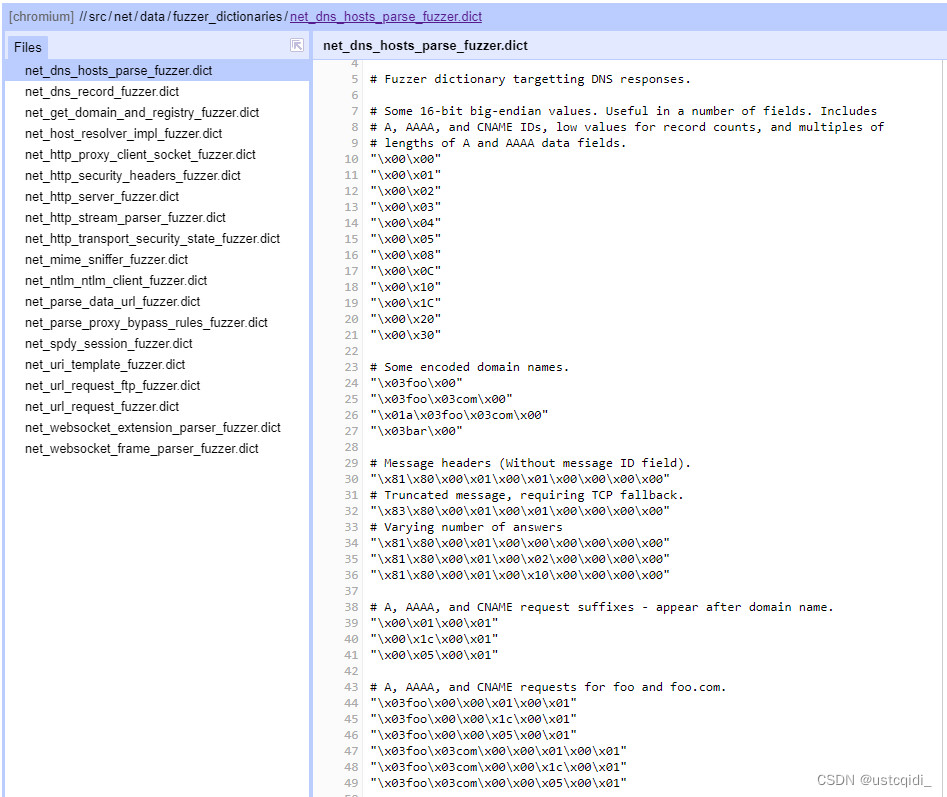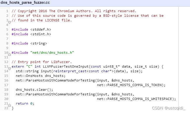 Chromium 的 fuzz test 文件命名规则为 xxx_fuzzer.cc, 因为只需要在 fuzz target 中把随机数据输入到待测试的接口中就行了,所以代码比单元测试少的多,下图是 dns_hosts_parse 的 fuzz testing