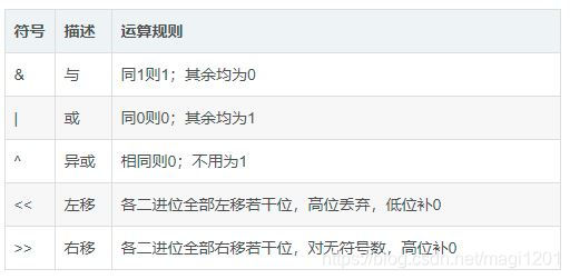 常见的位运算符见表格中,主要有&(与)、|(或)、^(异或)、<<(左移位)和 >>(右移位)。