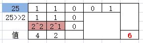 25>>2 ,25的二进制表示为11001,右移两位,相当于去掉末尾两位,结果为110,二进制110转换为10进制为6。