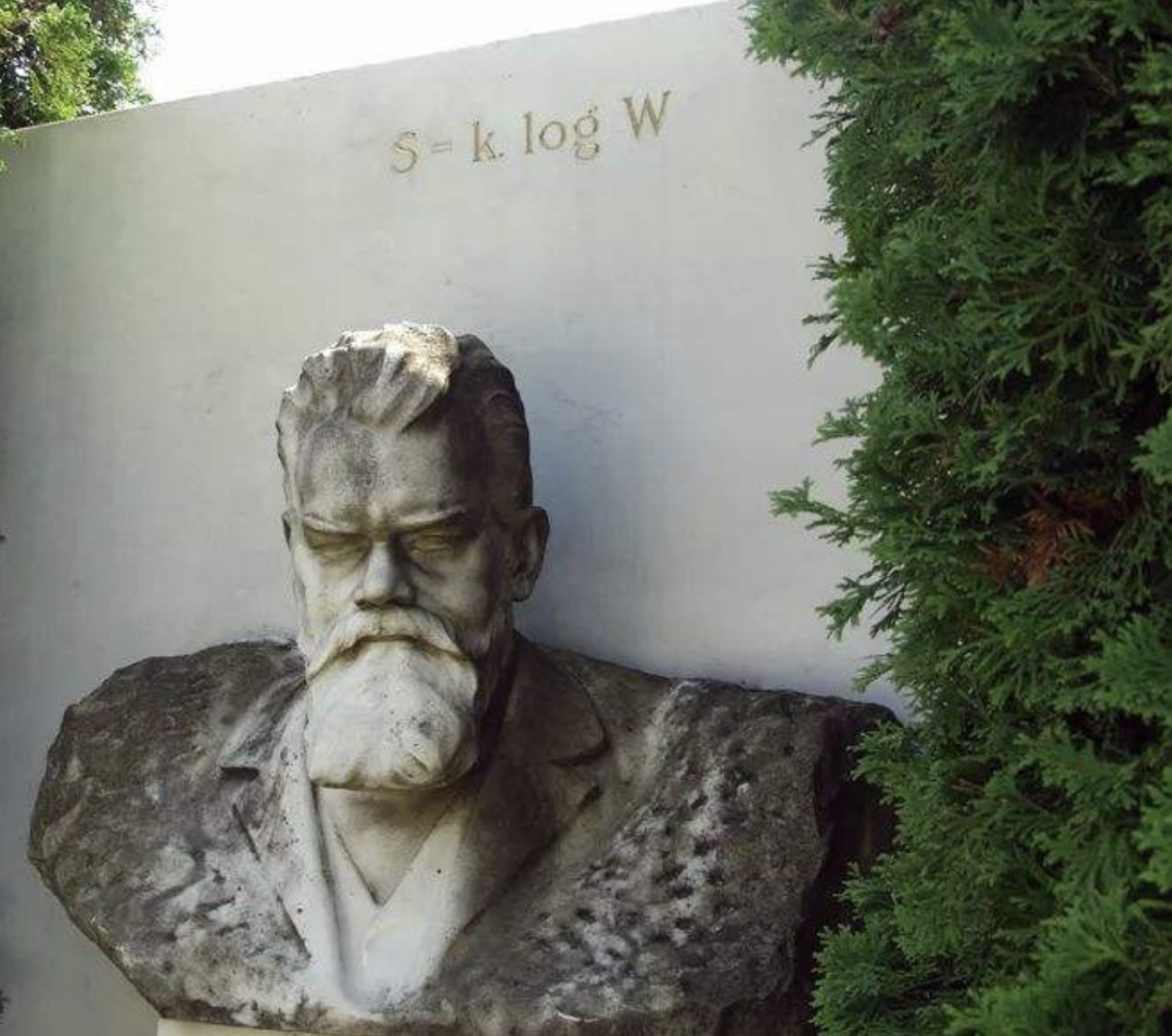 J 是能量单位焦耳, K 是温度单位开尔文.这行公式刻在玻尔兹曼位于维也纳的墓碑上。