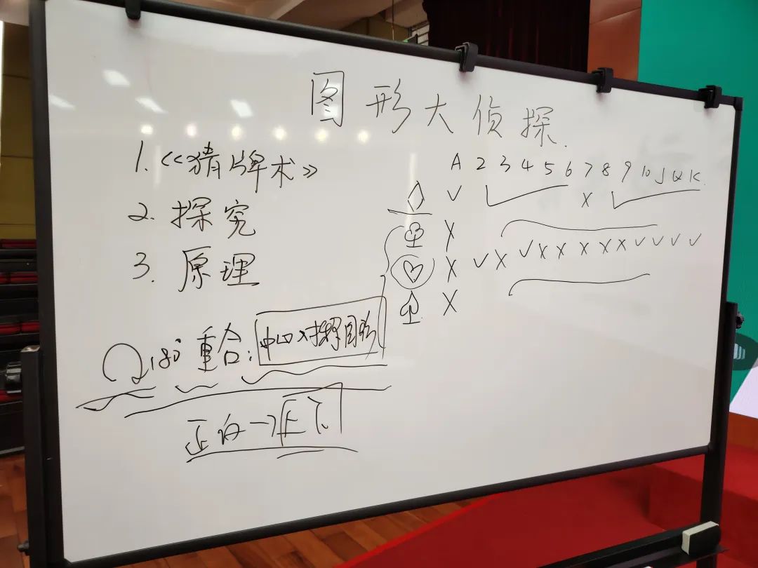 于是,和肖老师确认了讲座现场的细节后,就开始内容的冲刺熟悉了。这个中心对称的内容,最早的授课还要追溯到2021年首次在荔湾小学的活动,接着在最近的数学魔术师的种子班也再度使用了这个内容。从魔术本身的神奇度、操作性价比,包括数学知识和探究过程的设计上,也已经经过了足够的迭代,无论框架还是每个细节的强调,几乎达到了逐字稿的级别。唯一的问题是实际只有不到1小时的时间,我要选择性压缩到学生也能有完整收获的层面上,不能是没讲完的感觉。于是我尝试精简了探究部分,尤其是推理中的牌张中心对称性的判别,中心对称原理和正反的定义则是点到为止,应用和后续的表演、拓展等就自然略过了。因为是突出数学重点的课,魔术部分在保持完整性的情况下,删减细节也是最优的选择了。