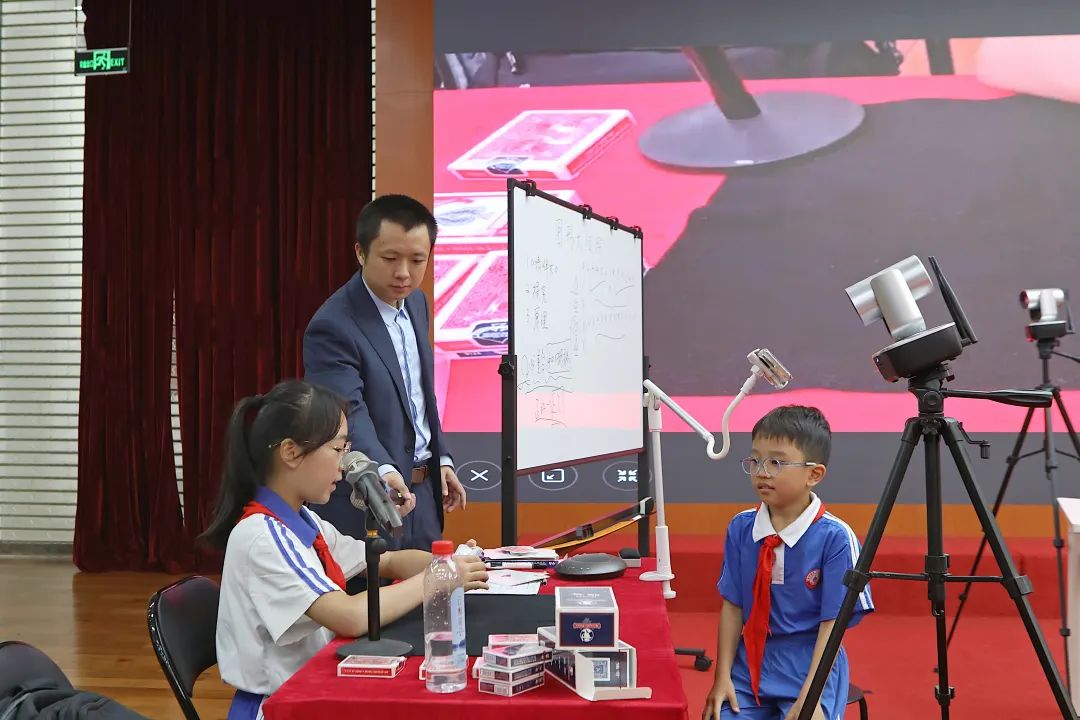 到讲解完每张牌的朝向,现场主持人和孩子玩了一圈24点游戏,还剩10分钟。这时我果断按照计划压缩了后续的正反讲解和中心对称的内容,并顺利掐点保留了让孩子上来表演的过程,取其精华,也毫无设计感。孩子表演得也很不错,算是对这节公开课效果的明证了。后续也依旧有孩子上来要签名环节,很开心,获得了小可爱的喜欢和认可。