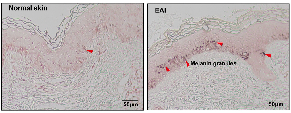图7. 经过Masson-Fontana染色的正常皮肤与患有火激红斑(EAI)的皮肤切片,这种染色会将黑色素颗粒染成深色,可见EAI皮肤中黑色素含量明显偏高。