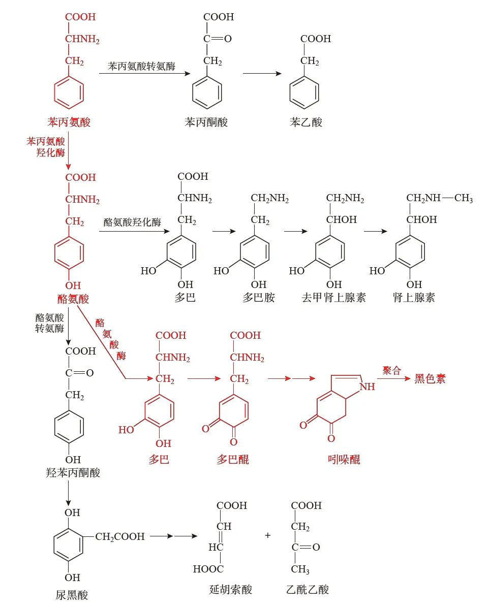 图4. 苯丙氨酸的代谢途径,其中黑色素的代谢路径标红