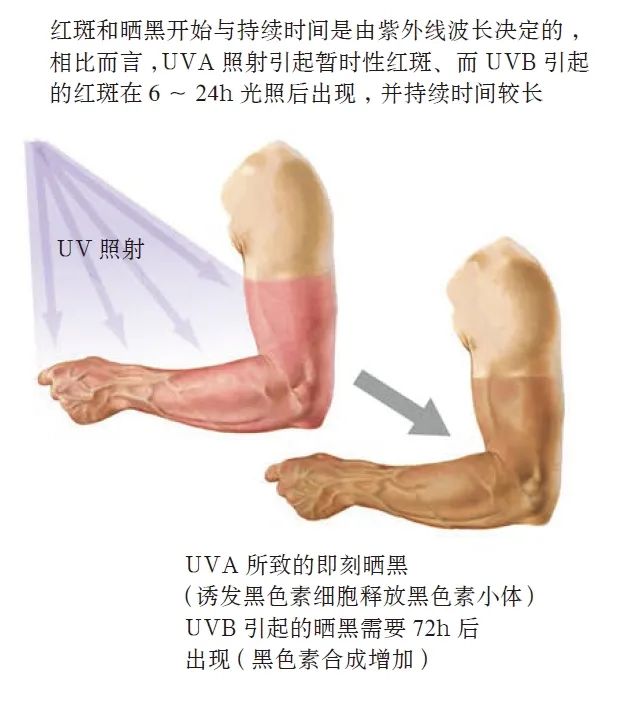 UVA主要作用于真皮层深部,但光子能量较低,对DNA损伤有限。UVA引发皮肤变黑的主要途径是促使黑色素细胞释放黑色素小体,从而导致即刻晒黑。这种晒黑一般会在几天内消退。