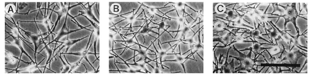 图5. (A)未经过处理、(B)UVB暴露处理、(C)热处理后黑色素细胞的显微照片,可见热处理后细胞体积明显增大