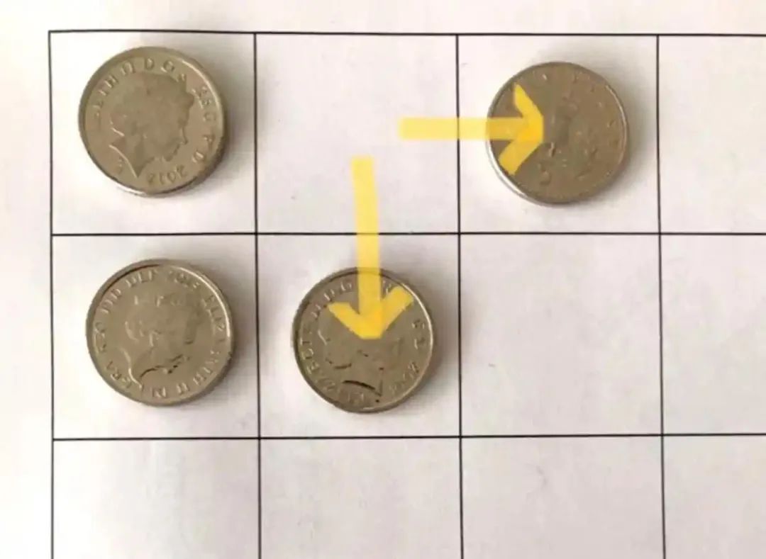 游戏只有一种操作。你可以拿掉任何一枚硬币,但是需要马上在这枚硬币的右边和下边的格子里补上两枚硬币。比如,如果你拿掉了上方第二个硬币,你需要按下图中的方式,马上补上两枚。