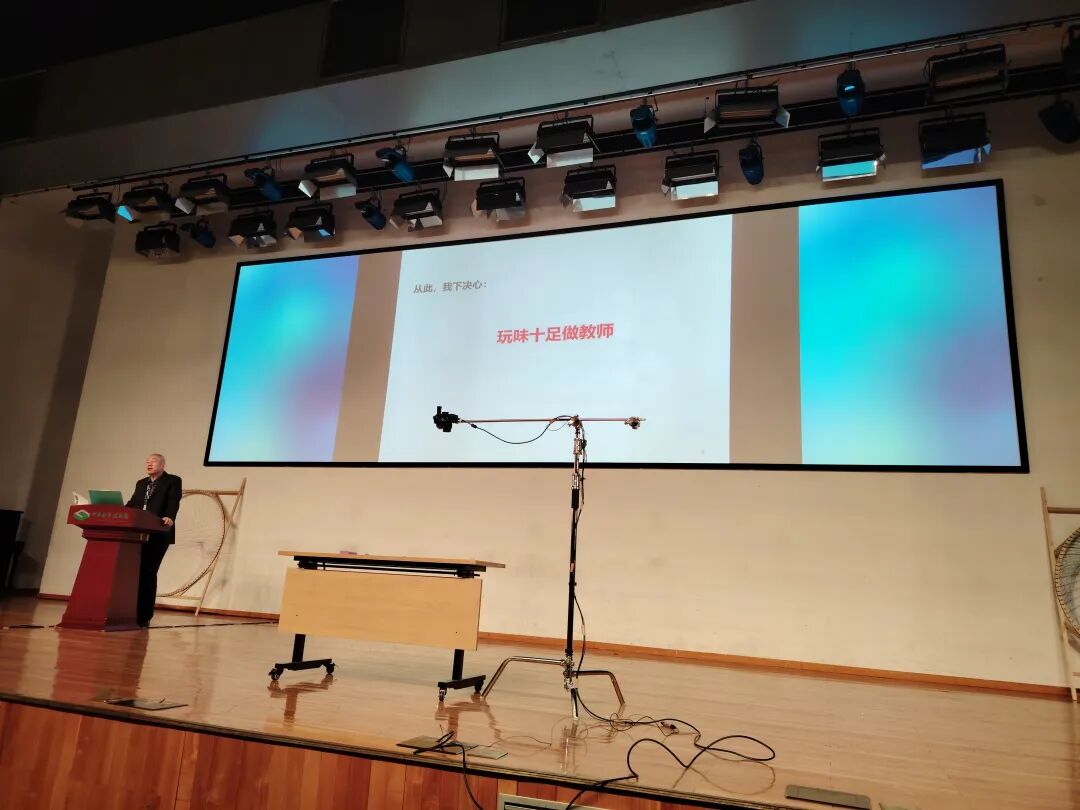 9:30到了现场,就碰到任老师也在台上捣鼓扑克牌和摄像机位,我小心确认后没想到他也早了解过我,也是互相欣赏,听到他分享中吐出来的内容之在行,甚至有点惺惺相惜的感觉。晚上我们在晚上饭局上也聊了很久,互相分享了数学魔术和游戏的一大堆点子,发现这个游戏教育局长果然名副其实,是个真的游戏老顽童。