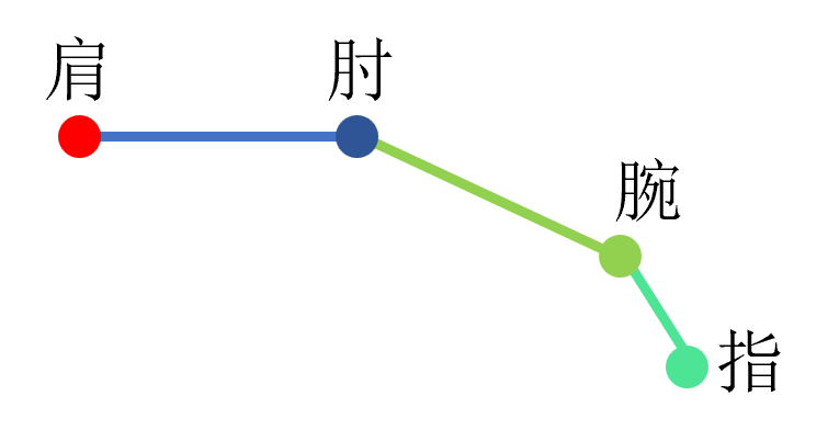 第二种情况则是利用鞭梢效应,我们手指的速度的提升来源于多段过程的传递,由人体的大臂、小臂和手,进行逐节的动量传输。在甩手(臂)的过程中,系统满足角动量守恒,即系统不受外力作用或所受外力对某定点(或定轴)的合力矩为零。这个甩手过程可以分为肩关节→肘关节→手腕,近似成三节棍进行一个动量传输,如下图: