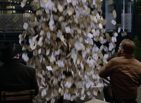 在这个名场面里,阿特拉斯让漫天雨滴瞬间静止在空中,甚至倒升回天空,这是利用视觉暂留、人造雨与频闪灯制造的帧率错觉,当观众的眼睛随着频闪锁定时,就只能看到同一位置水滴的残影,在我们大脑处理下,就被认为雨悬停在了空中。