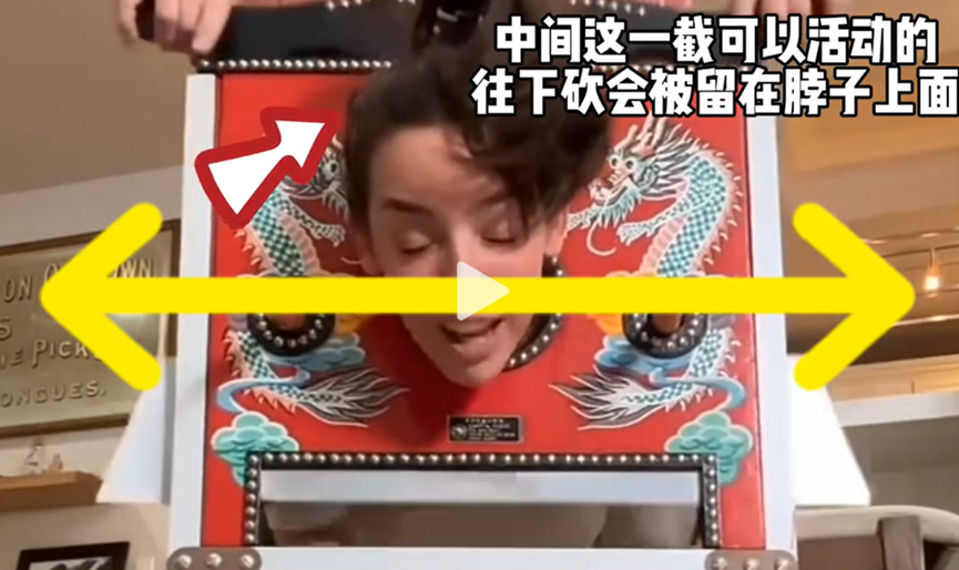 首先是铡刀,在外观上来看铡刀应该是对准的颈部,但实际上铡刀应该是开了一个小缝,有个夹层,中间为真刀片,两侧是可移动的假金属片。当刀落下的时候,假刀片会停在台面下方2-3cm处,而真刀片则会错开脖颈落下,营造出刀整个斩首的错觉。