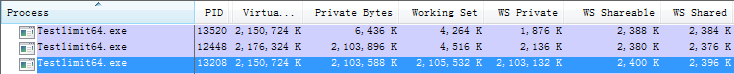 | TestLimit -m 2048 –c 1 | Commit 1G 内存, 但不访问这些内存 | 12448 |