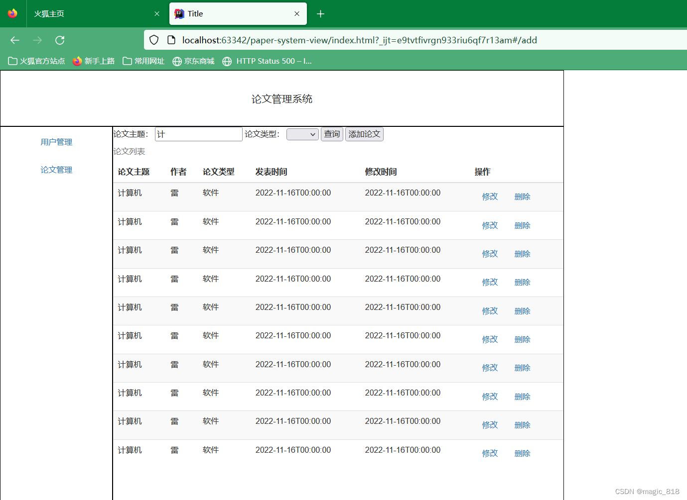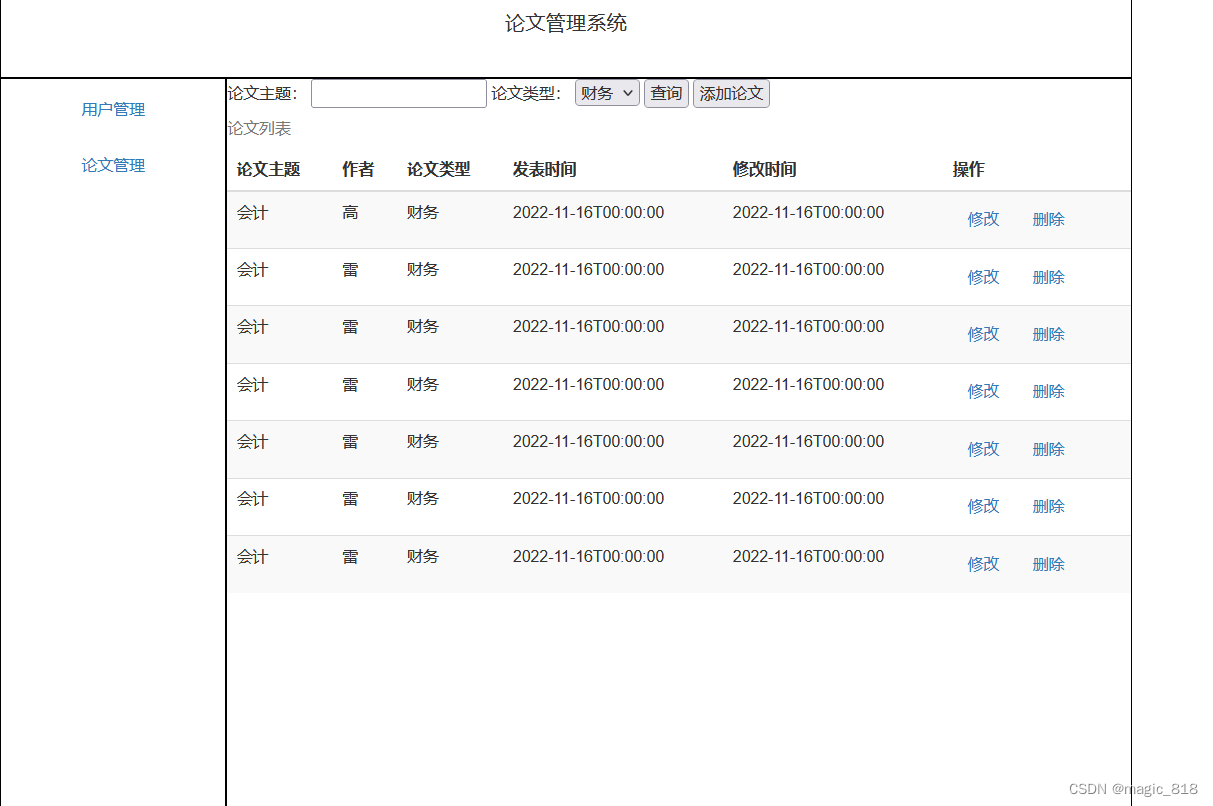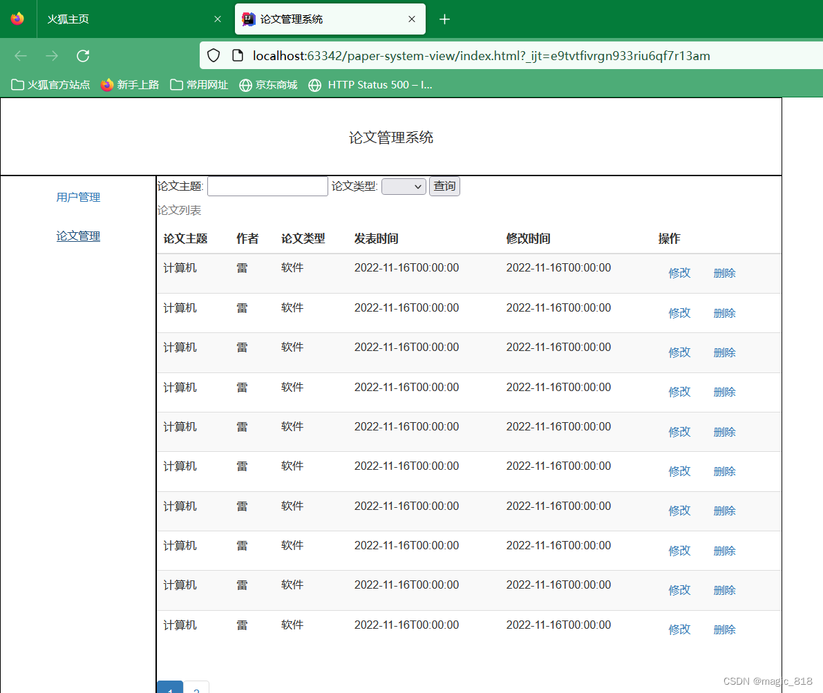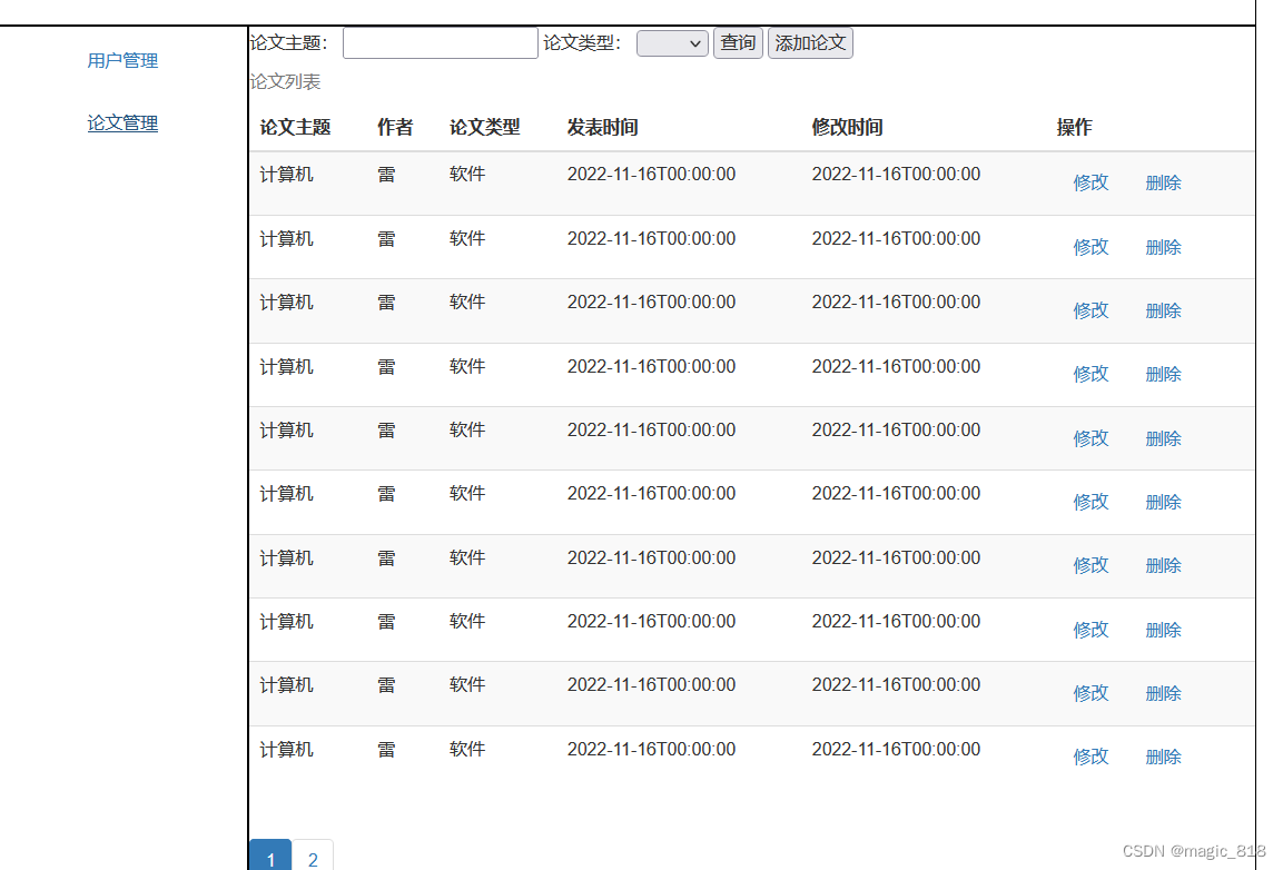 上次我们已经实现了论文管理系登录功能,这次我们要实现登录之后的跳转到首页,并且让首页列表显示出数据库的信息并在Mapper中写入模糊查询功能语句,这次我们不使用MybatisPlus写这个功能,这次使用Mybatis来写,区别就是Plus是继承于<BaseDAO>Mapper,而Mybatis则是我们通过读取Mapper.xml文件中的sql语句,实现效果如下图所示,: