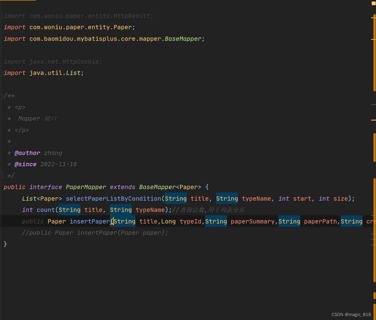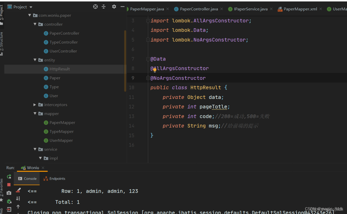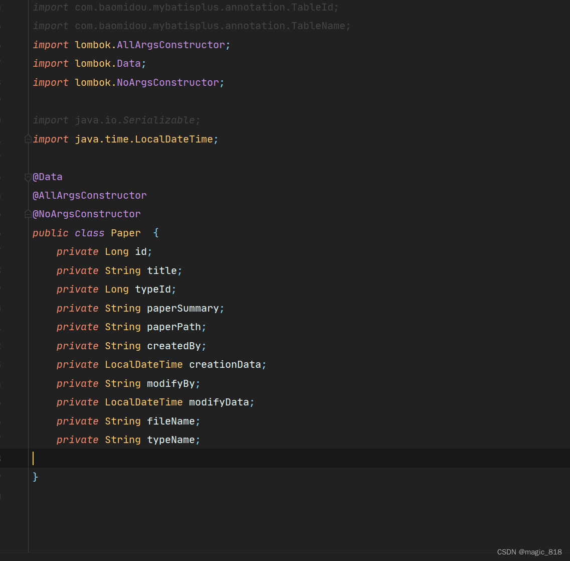 这里大家发现实体类里面多了一个属性typeName,这是方便我们后面模糊查询,因为paper数据表中的的论文类型是id,不是文本形式,没有办法进行模糊查询,所以我们需要在里面自己加入typeName这个变量