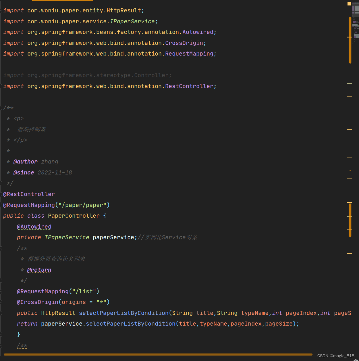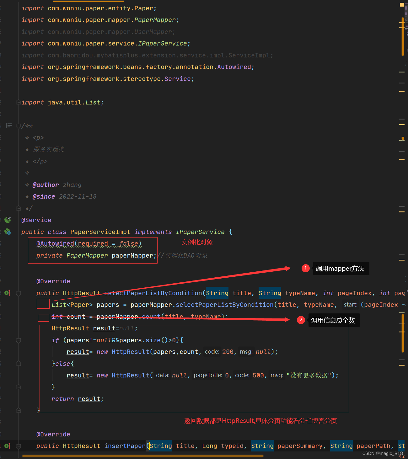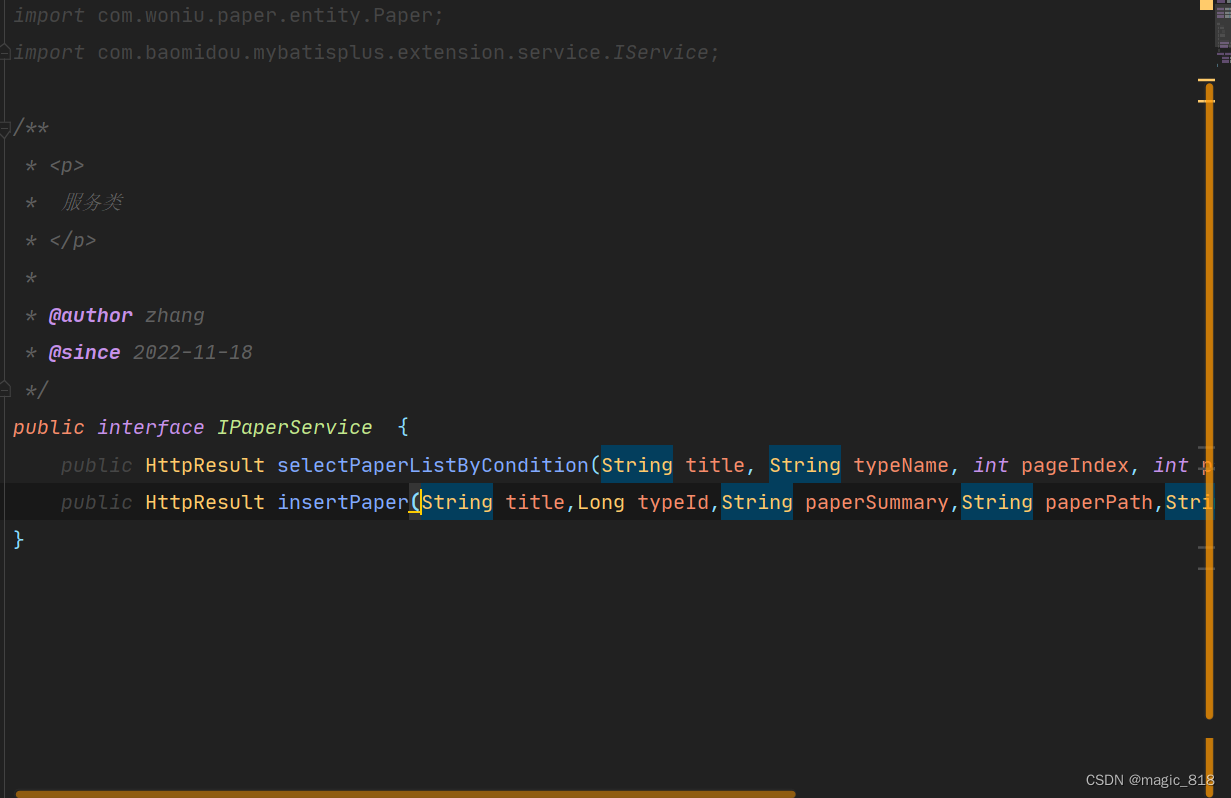 这里大家发现实体类里面多了一个属性typeName,这是方便我们后面模糊查询,因为paper数据表中的的论文类型是id,不是文本形式,没有办法进行模糊查询,所以我们需要在里面自己加入typeName这个变量