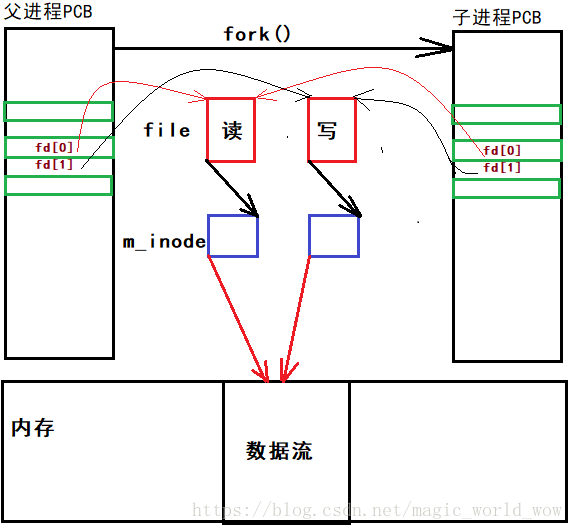 int pipe(int fd[2]);用于创建并打开一个无名管道,并且使fd[0]指向管道读端,fd[1]指向管道写端。