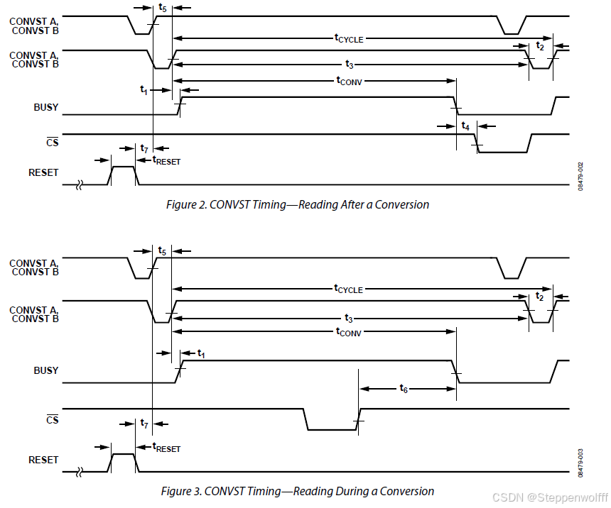 首先是读数据的时机,可以在转换结束之后在读取本次转换结果,也可以在转换的过程中读取上一次的转换结果,分别对应下面图片中的Figure 2和Figure 3。区别在于前者在BUSY为低之后才拉低CS管脚开始读数据,而后者则是在BUSY期间就拉低了CS管脚进行读数据。注意:手册提到,在BUSY高时读取的任何数据必须在BUSY下降沿发生之前完成。当BUSY信号高时,CONVST A或CONVST B上的上升沿没有影响。