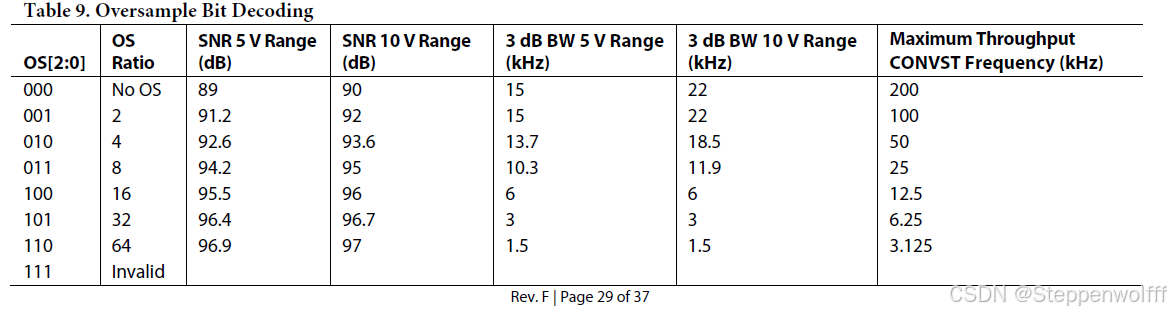 - Pin OS0~PinOS2用于控制过采样率选择,OS2是MSB控制位,OS0是LSB控制位。可以根据需要选择硬件或者软件的方式控制过采样,真值表如下:
