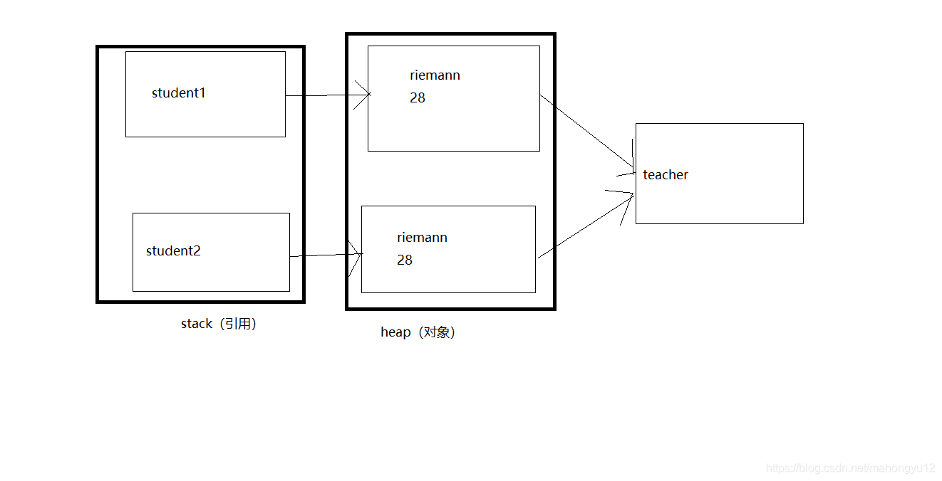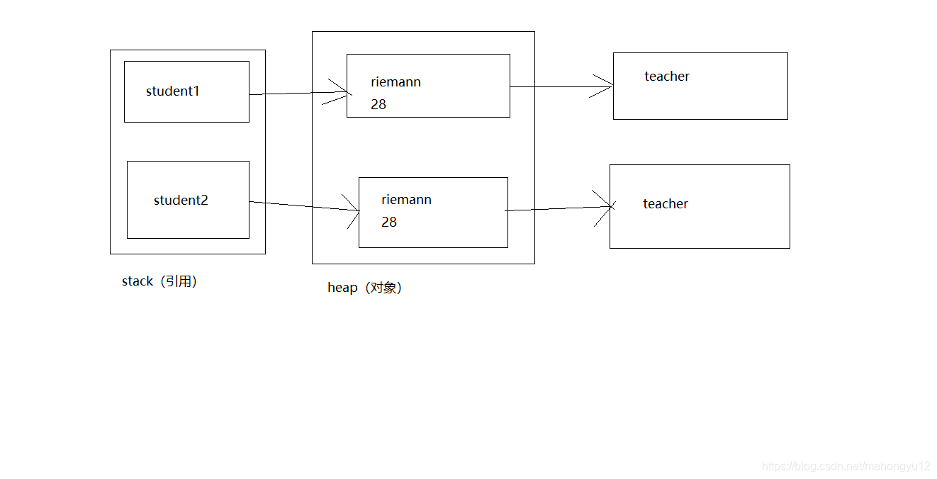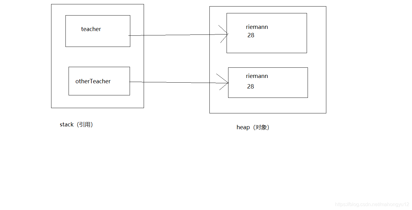 结果分析:由输出结果可以看出,它们的地址值是相同的,那么它们肯定是同一个对象。teacher和otherTeacher的只是引用而已,他们都指向了一个相同的对象Teacher(“riemann”,28)。 这就叫做引用拷贝。