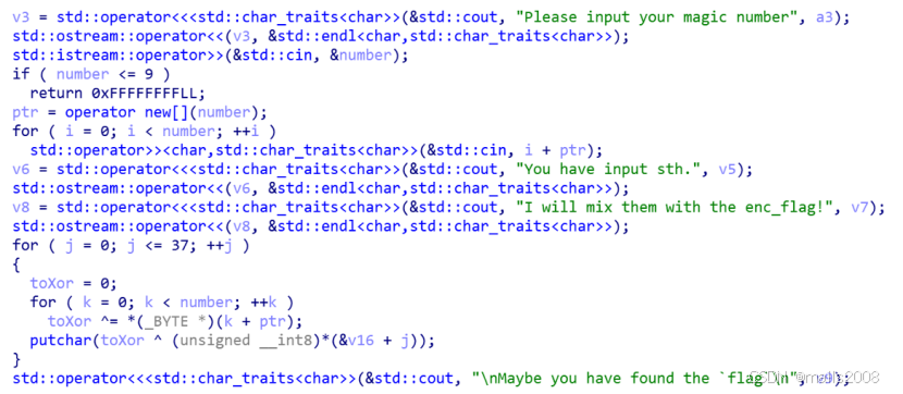读入超过10个数,看到加密是一个嵌套循环,自己异或后,再和数组每位进行异或,最终输出加密后的数组。