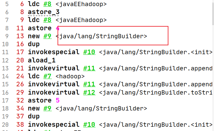 13 invokespecial #10 <java/lang/StringBuilder.<init>> // 这里相当于是调用StringBuilder的构造器,new一个StringBuilder