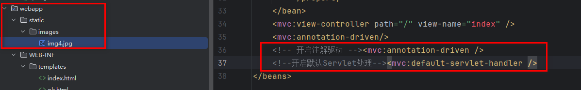 在springmvc.xml文件中添加以下配置,启用默认Servlet处理静态资源功能: