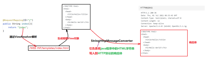 这段代码是我们之前常用的实现方式:Controller返回的逻辑视图名称,会由视图解析器转换为物理视图名称并生成视图对象。随后,StringHttpMessageConverter将视图对象中的HTML字符串写入HTTP响应体,从而完成整个响应流程。