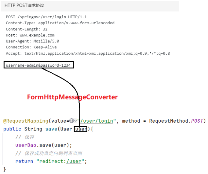 这段代码是我们之前经常编写的。请求体中的数据会通过HttpMessageConverter接口的实现类FormHttpMessageConverter转换为user对象。
