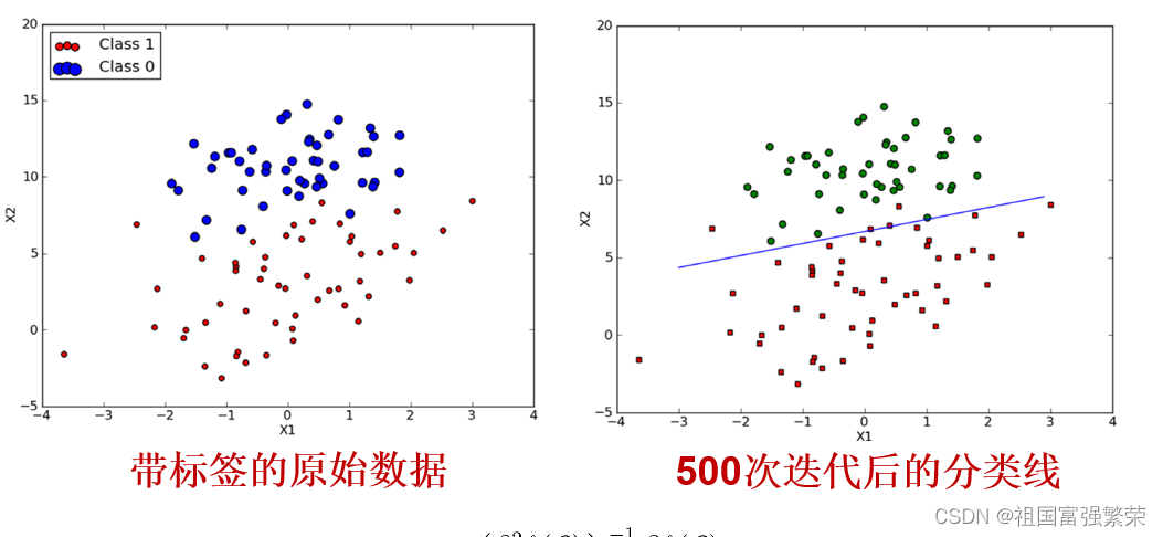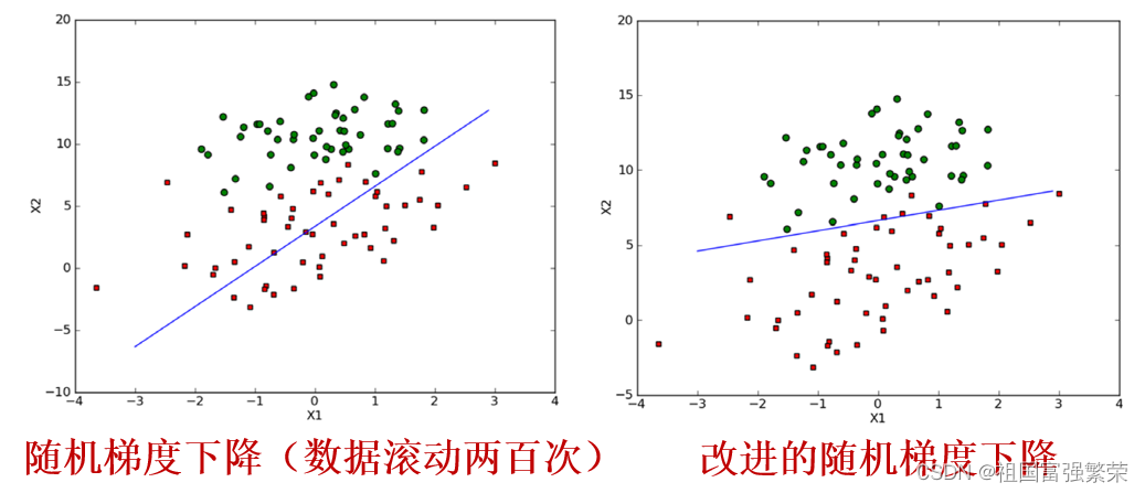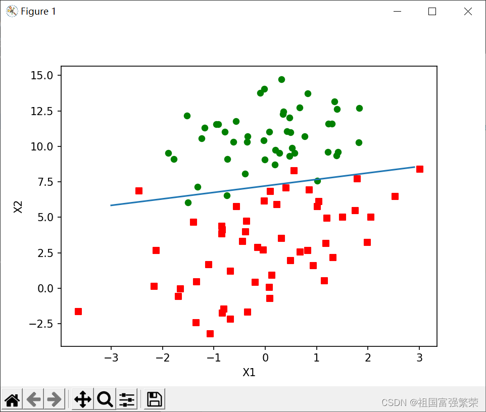 y = (-w[0] - w[1] * x) / w[2] #设sigmoid =0,因为sigmoid = 0是两种类别的分界线 sigmoid = w0x0+w1x1+w2x2 = 0