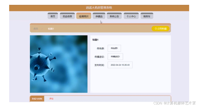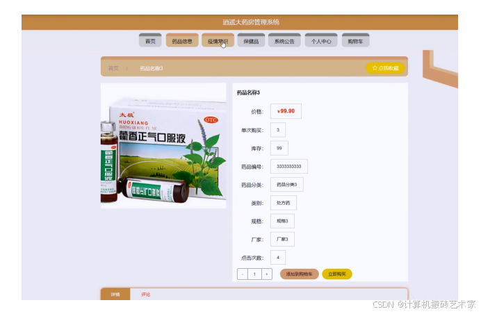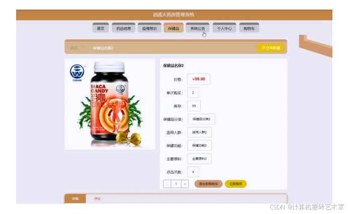 系统主要包括首页,个人中心,用户管理,保健品分类管理,药品分类管理,药品信息管理,疫情常识管理,保健品管理,系统管理,订单管理等功能模块。