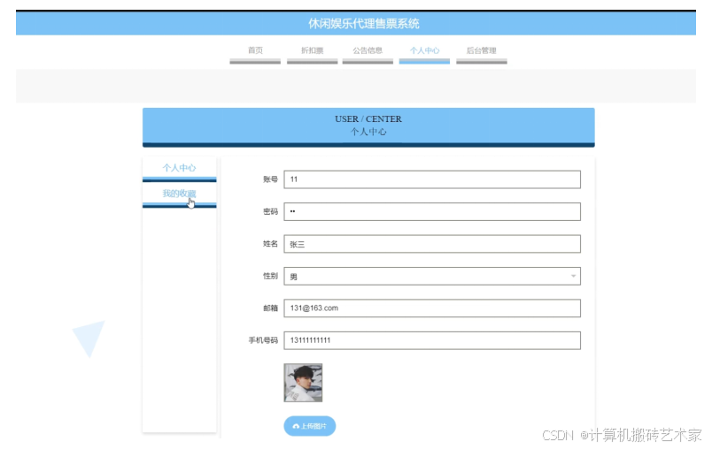 系统能够通过互联网得到广泛的、全面的宣传,让尽可能多的用户了解和熟知休闲娱乐代理售票系统的便捷高效。系统主要包括首页、个人中心、用户管理、折扣票管理、分类管理、订单信息管理、退票信息管理、出票信息管理、系统管理等功能模块。