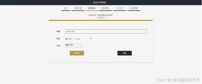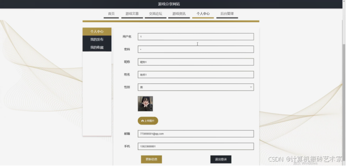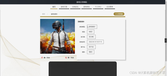 - 系统功能包括管理员和用户两个角色,主要功能有首页、个人中心、用户管理、游戏类型管理、游戏文章管理、交流论坛、系统管理等。