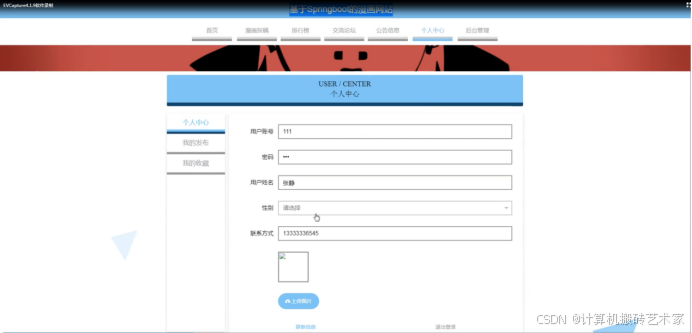 - 系统功能包括首页、个人中心、用户管理、漫画分类管理、漫画投稿管理、分类管理、排行榜管理、交流论坛、系统管理等。
