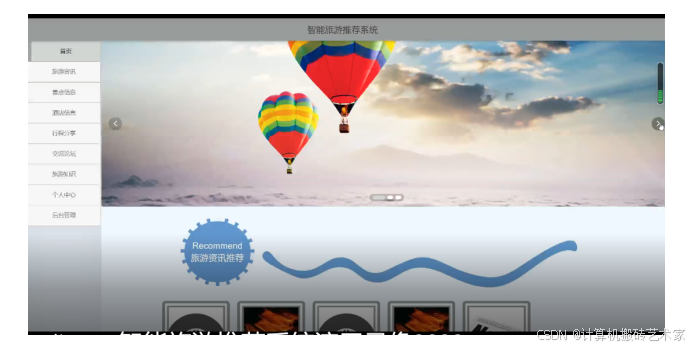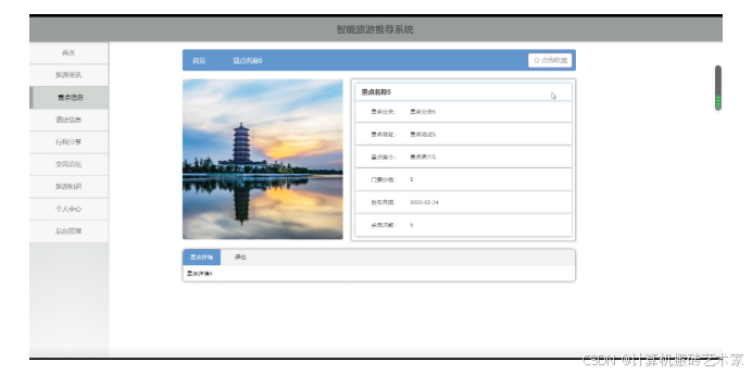 - 智能旅游推荐系统主要实现首页,个人中心,用户管理,旅游资讯管理,景点信息管理,景点分类管理,酒店信息管理,行程分享管理,交流论坛,系统管理等功能的操作系统。