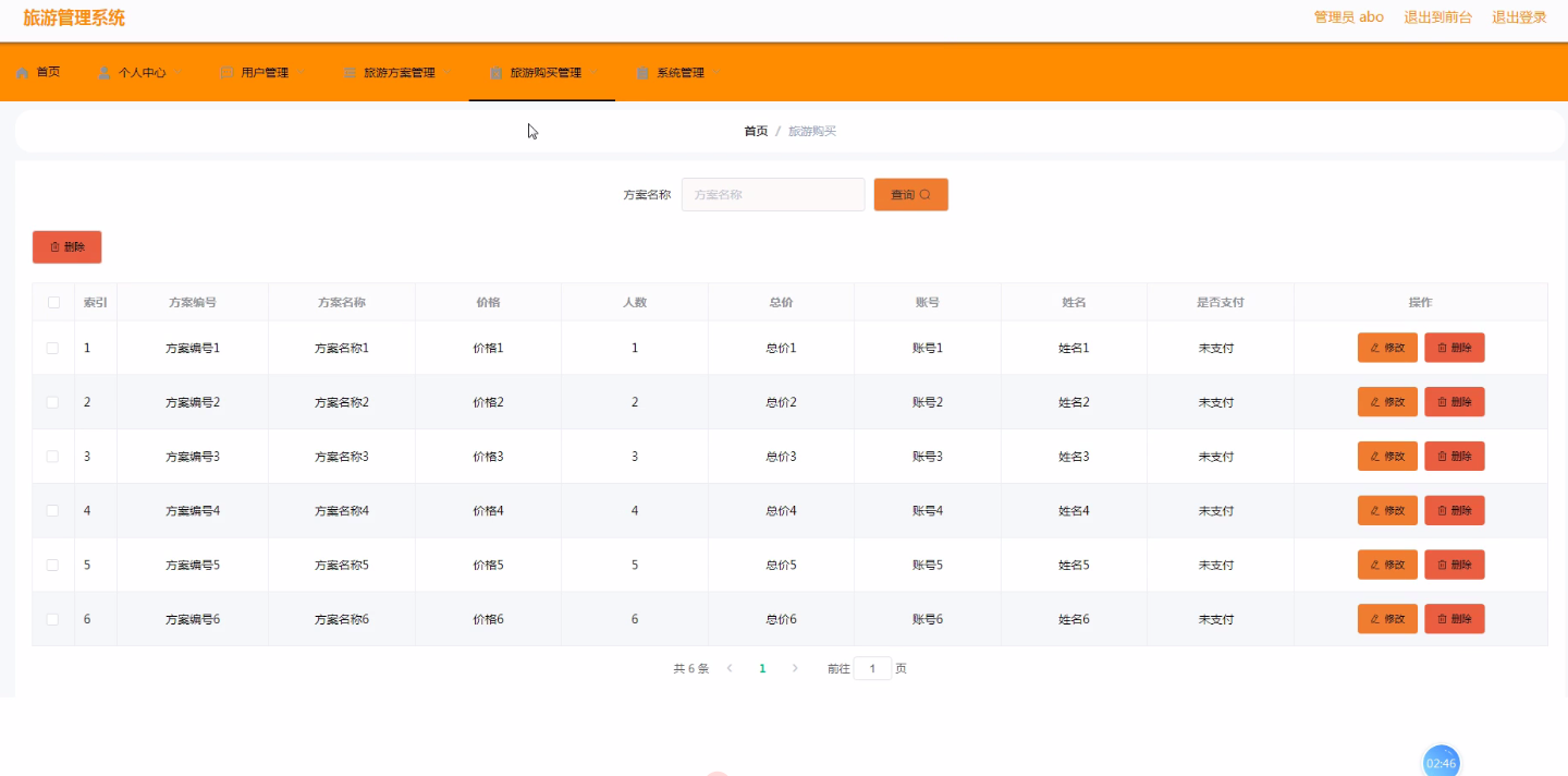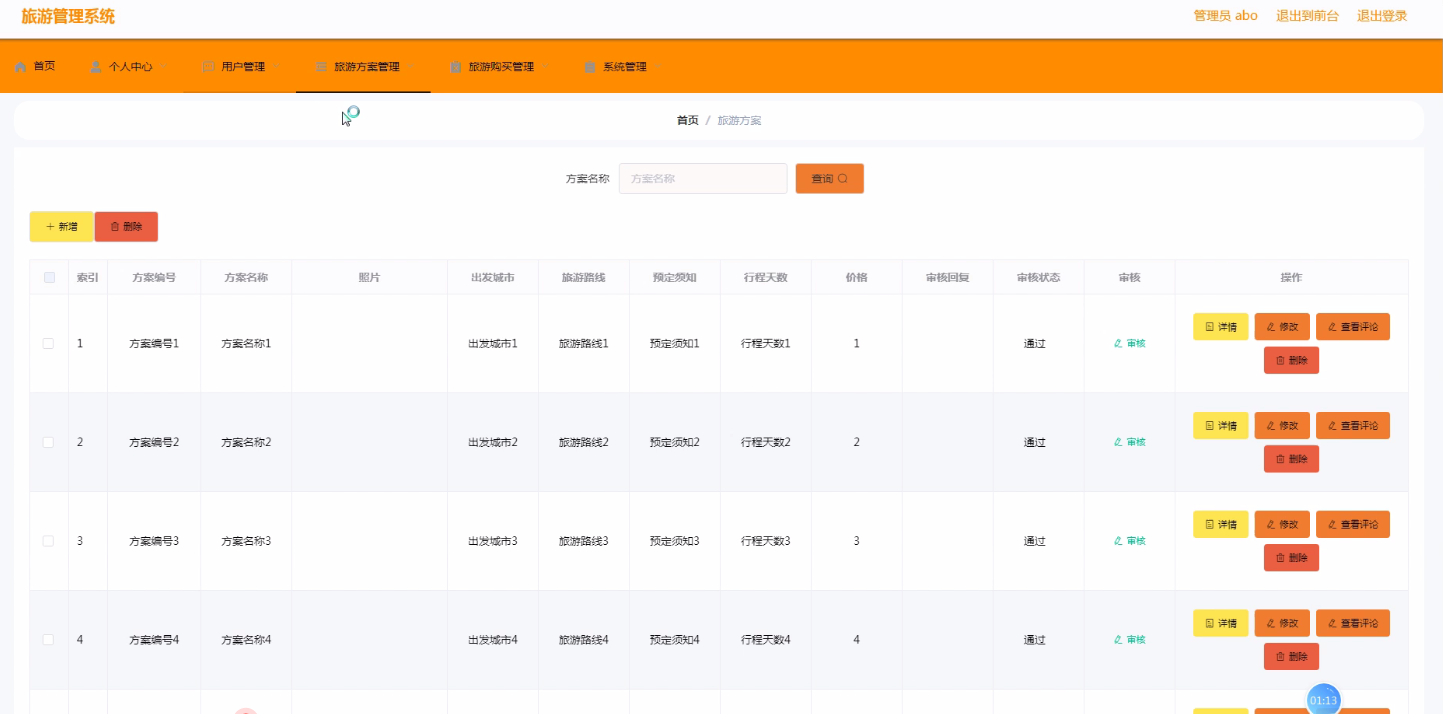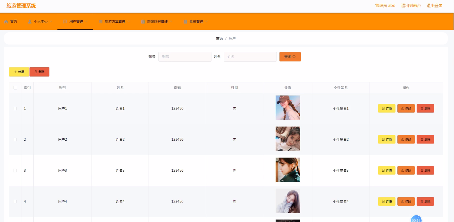 管理员功能:首页、个人中心、用户管理、旅游方案管理、旅游购买管理、系统管理。用户功能:首页、个人中心、旅游方案管理、旅游购买管理、我的收藏管理。前台首页功能:首页、旅游方案、旅游资讯、个人中心、后台管理。