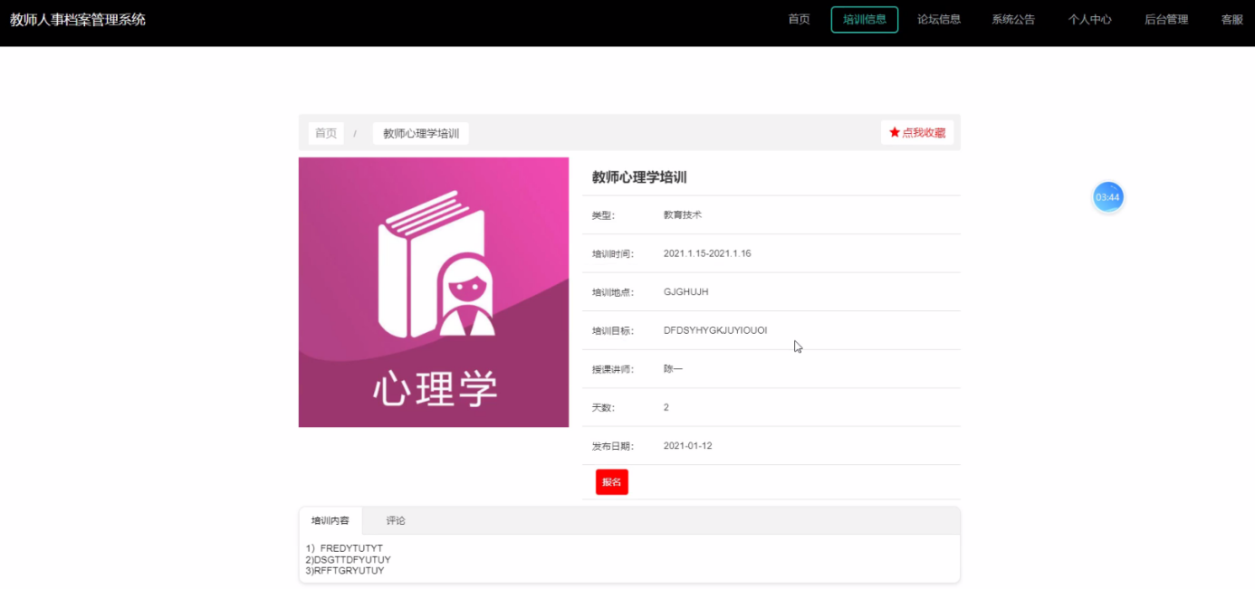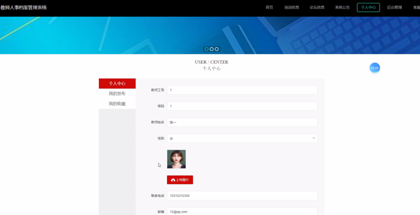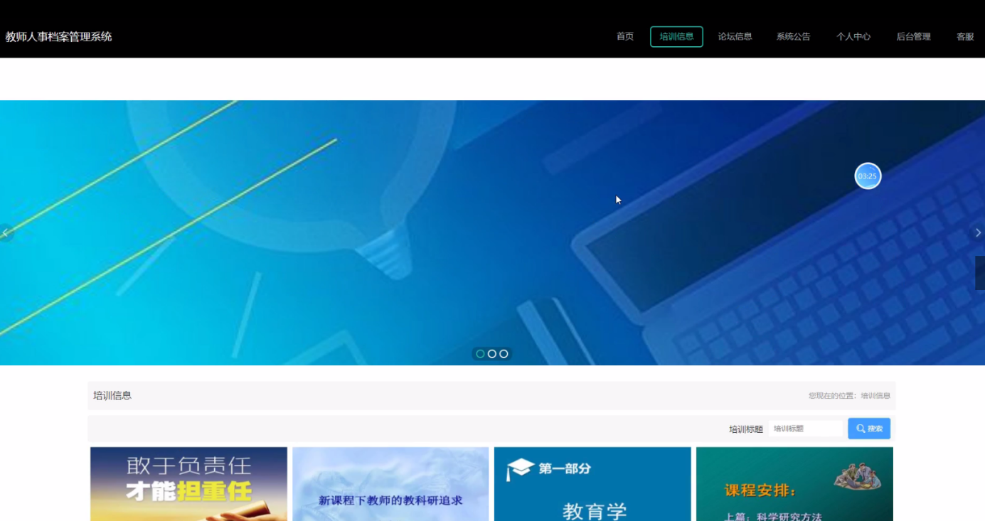 管理员功能:首页、个人中心、教师管理、个人档案管理、奖惩信息管理、档案变动管理、培训学校管理、培训报名管理、课程信息管理、论坛管理、系统管理。教师后台功能:首页、个人中心、个人档案管理、奖惩信息管理、档案变动管理、培训报名管理、课程信息管理、我的收藏管理。前台功能:首页、培训信息、系统公告、个人中心、后台管理、客服。