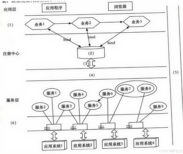 (1) 业务层 (2)UDDI (3)public (4)企业服务总线ESB (5)安全验证与质量管理 (6)组件层