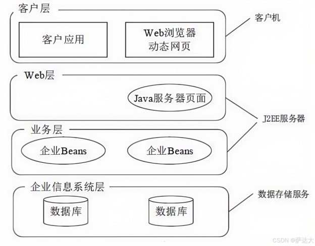 J2EE平台采用了多层分布式应用程序模型,实现不同逻辑功能的应用程序被封装到不同的构件中,处于不同层次的构件被分别部署到不同的机器中。四层结构: