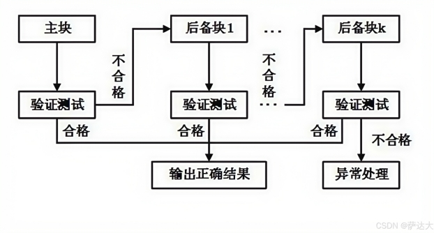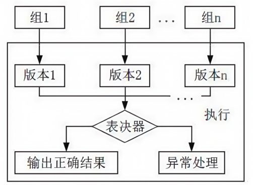 N版本程序设计是一种静态的故障屏蔽技术,人其设计思想是用N个具有相同功能的程序同时执行一项计算,结果通过多数表决来选择。其中N个版本的程序必须由不同的人独立设计,使用不同的方法、设计语言、开发环境和工具来实现,目的是减少N个版本的程序在表决点上相关错误的概率。M2采用动态冗余后的可靠度为: