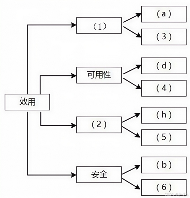 在架构评估过程中,质量属性效用树(utility tree)是对系统质量属性进行识别和优先级排序的重要工具。请给出合适的质量属性,填入图4-1中(1)、(2)空白处;并选择题干描述的 (a) ~ (m),填入 (3) ~(6)空白处,完成该系统的效用树。