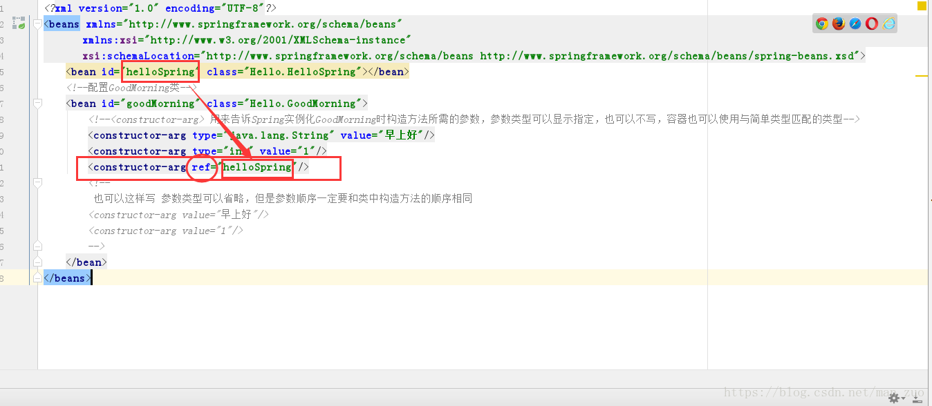 <constructor-arg ref="helloSpring"/>
