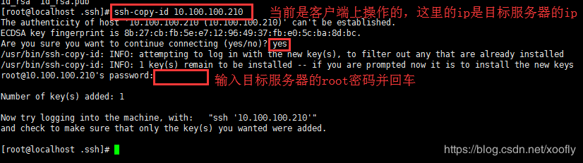 4.将客户端上生成的key拷贝(传)到服务器端:[root@localhost .ssh]# ssh-copy-id 10.100.100.210 这个Ip是目标服务器ip,然后按照提示输入yes回车,再输入目标服务器的root密码回车。