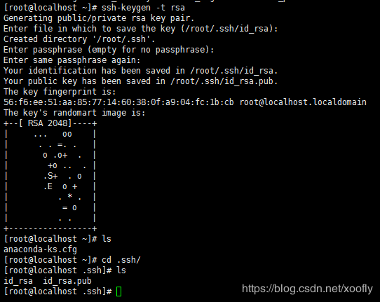 2.客户端生成key:[root@localhost ~]# ssh-keygen -t rsa一路回车即可,在root家目录就能生成一个隐藏文件夹.ssh