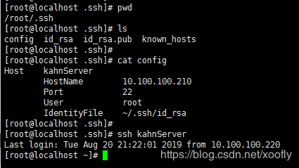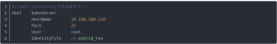 kahnServer是别名,它的地址是10.100.100.210,登录端口22,登录用户名root,秘钥文件是~/.ssh/id_rsa